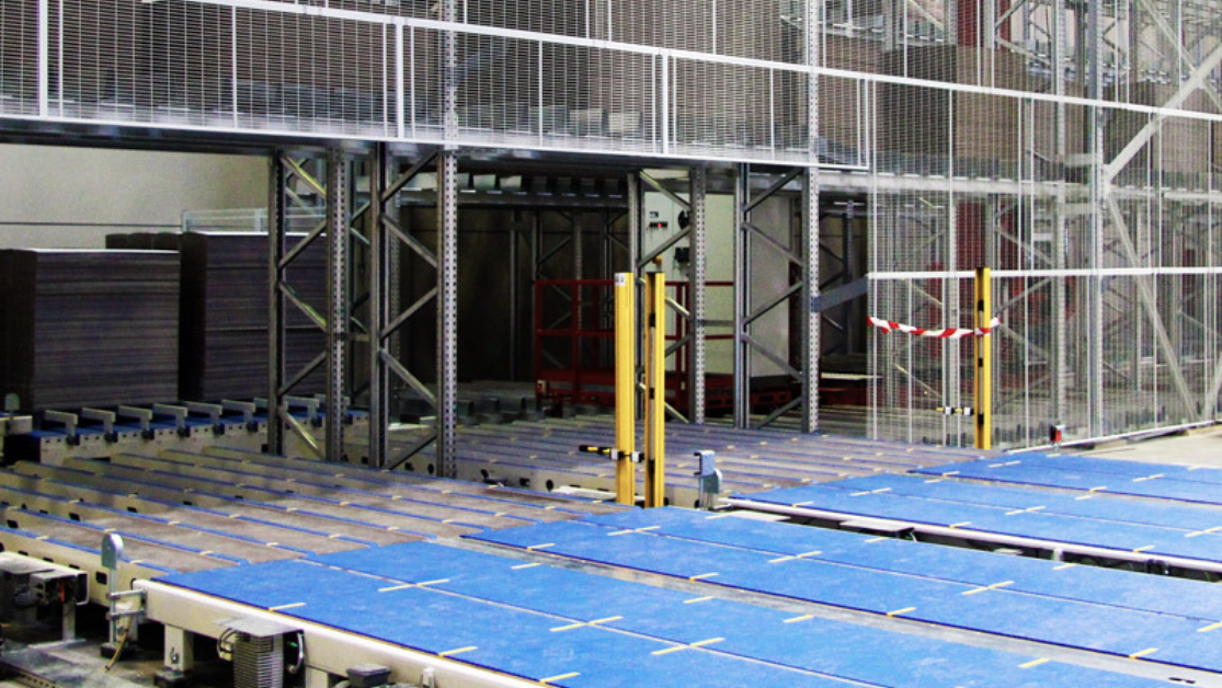 Accumulates individual panels into optimized load units for seamless transfer car movement